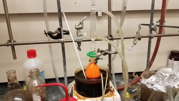 A quick glance at Khalid Mahmood’s lab station shows a chemist hard at work: an assortment of solvents, acids, salts, and more lie within an arm’s reach. At the center, suspended above a pot of oil used for heating, is a flask filled with a vivid orange mixture. Mahmood lifts the flask and pipettes a sample into a small beaker for testing. This Tuesday afternoon, his goal is to analyze this mysterious substance to determine its identity.
